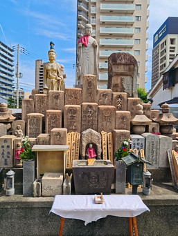Dans le Shitenno-Ji, on est accueilli par le battement d’énormes tambours qui résonnent à travers chaque édifice. Les Dieux étant très occupés, on fait du bruit pour attirer leur attention. Puis on chantonne d’une voix grave en tapant sur des calebasses (le métier de prêtre est très physique). Impossible de photographier l’intérieur des temples, c’est dommage parce qu’il y a de superbes statues du Bouddha, des gardiens des différentes portes qui grimacent en pointant leurs armes, des plafonds magnifiquement décorés. Par contre, on peut escalader la pagode à condition d’enlever ses chaussures.